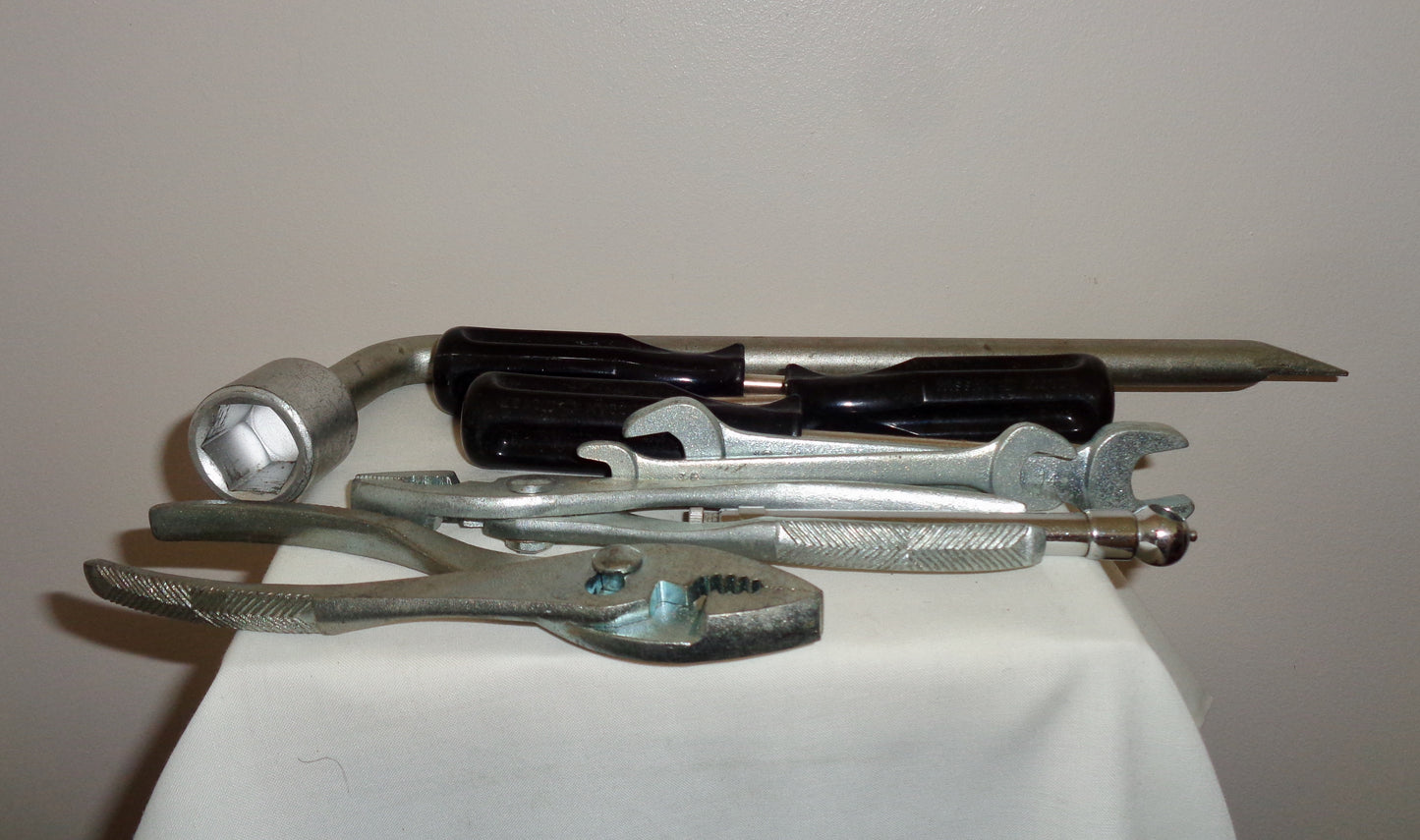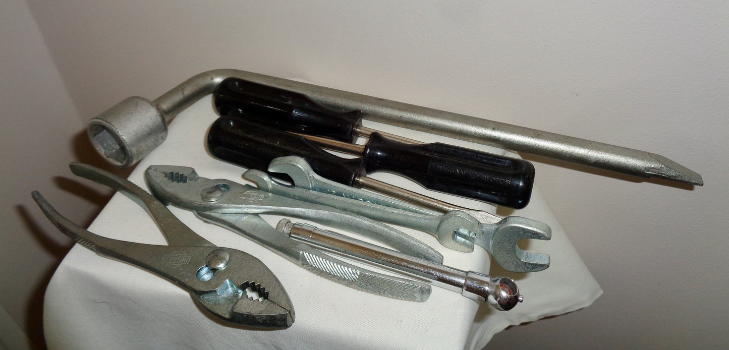 The bag, slightly grubby from storage and use, is intact. All the tools, metric sizes, are in good condition and look to have had little use. It's not often you find the tools with the kit bag. The perfect accessory for the classic Nissan car!