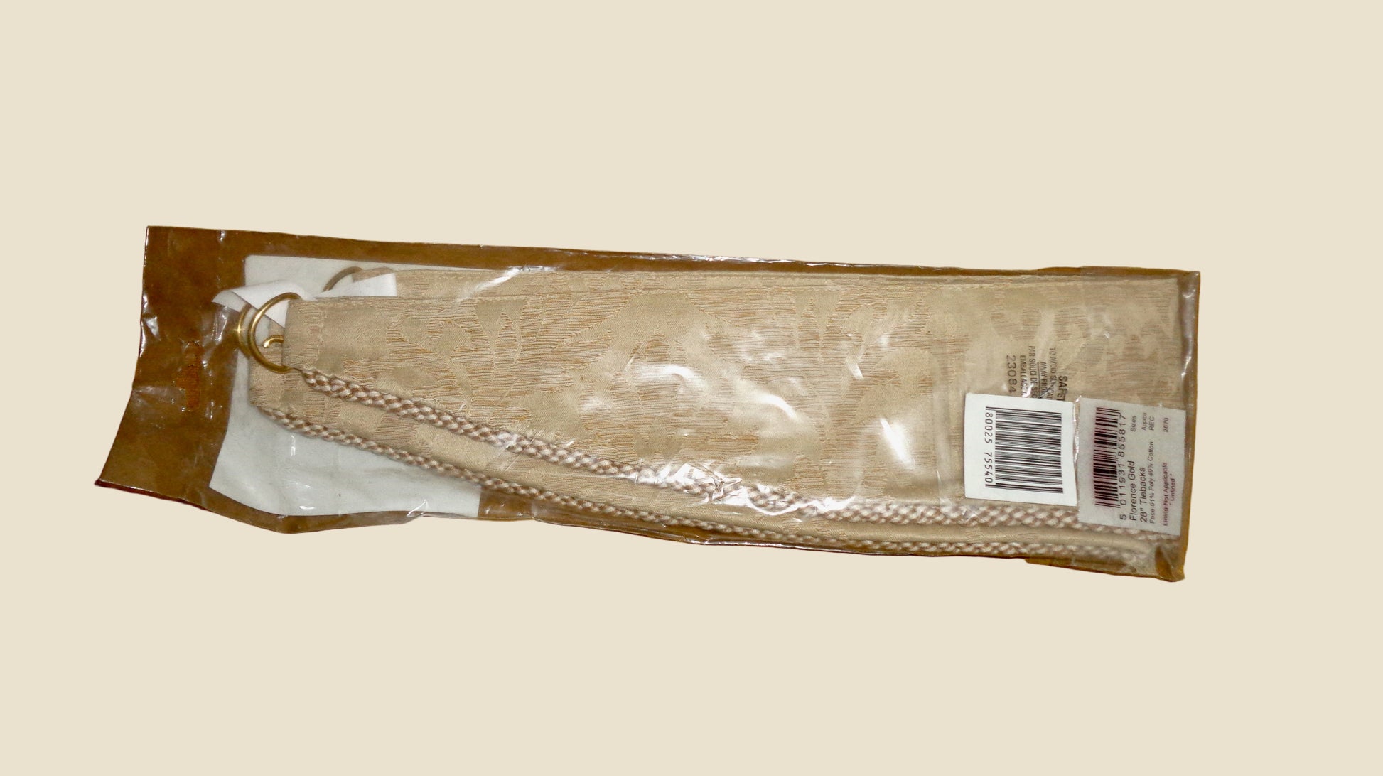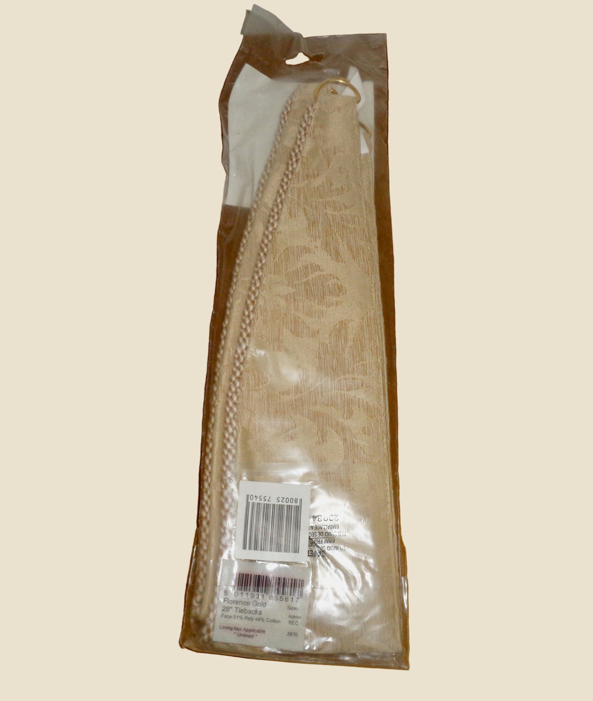 This lovely pair of 28 Inch Vintage Rectella Florence Gold Jacquard Floral Tie Backs NOS are still in their original plastic packaging and have never been hung!