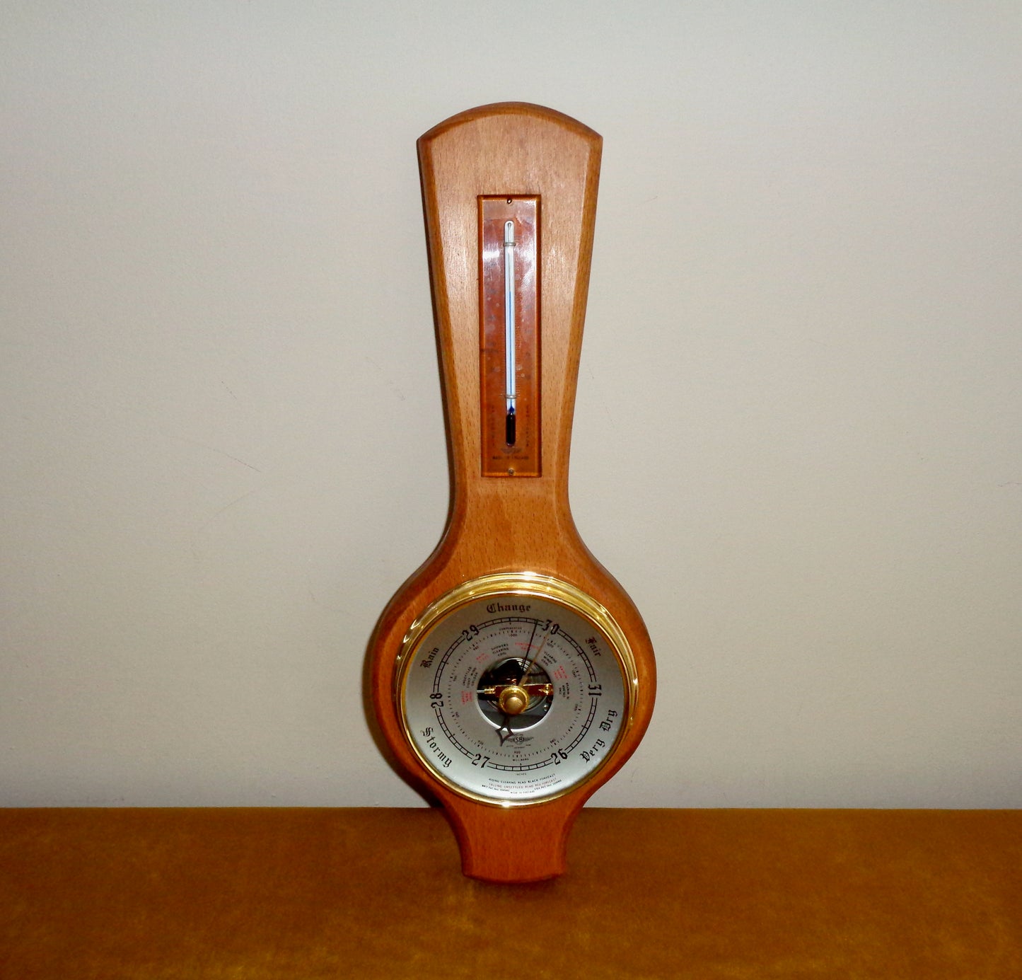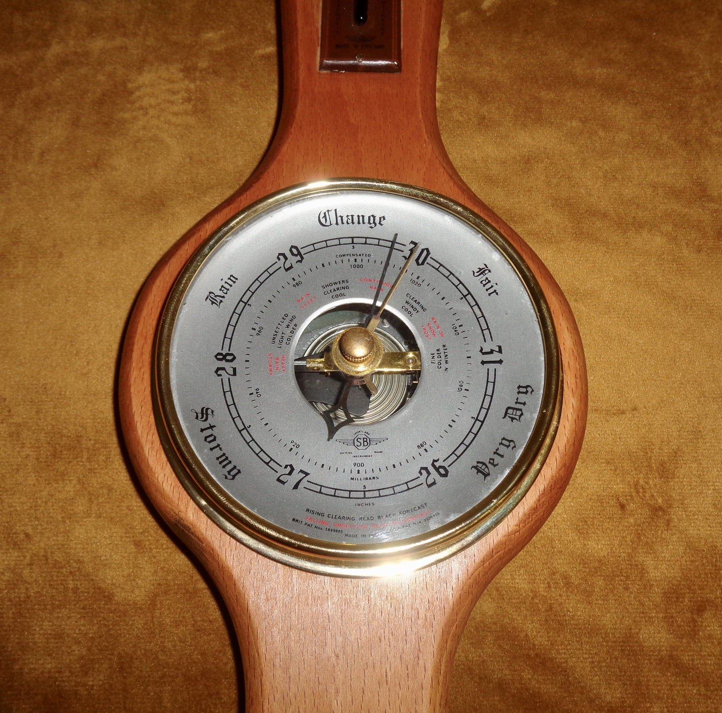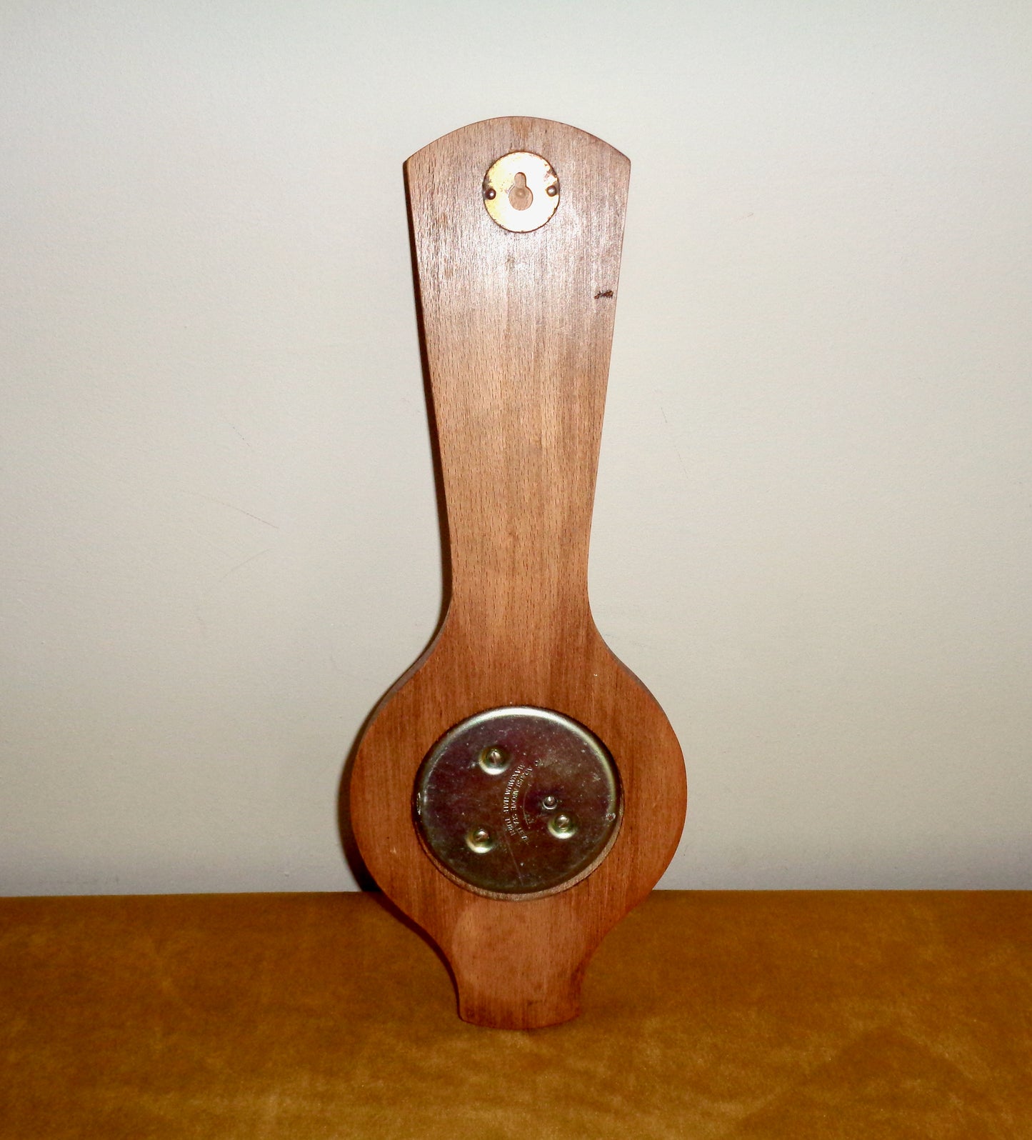 This is a very nice, traditional 1960s, Vintage Shortland SB Aneroid Barometer and Thermometer In An Elongated Wood Surround. It has a recess in the back so that it can be wall hung.