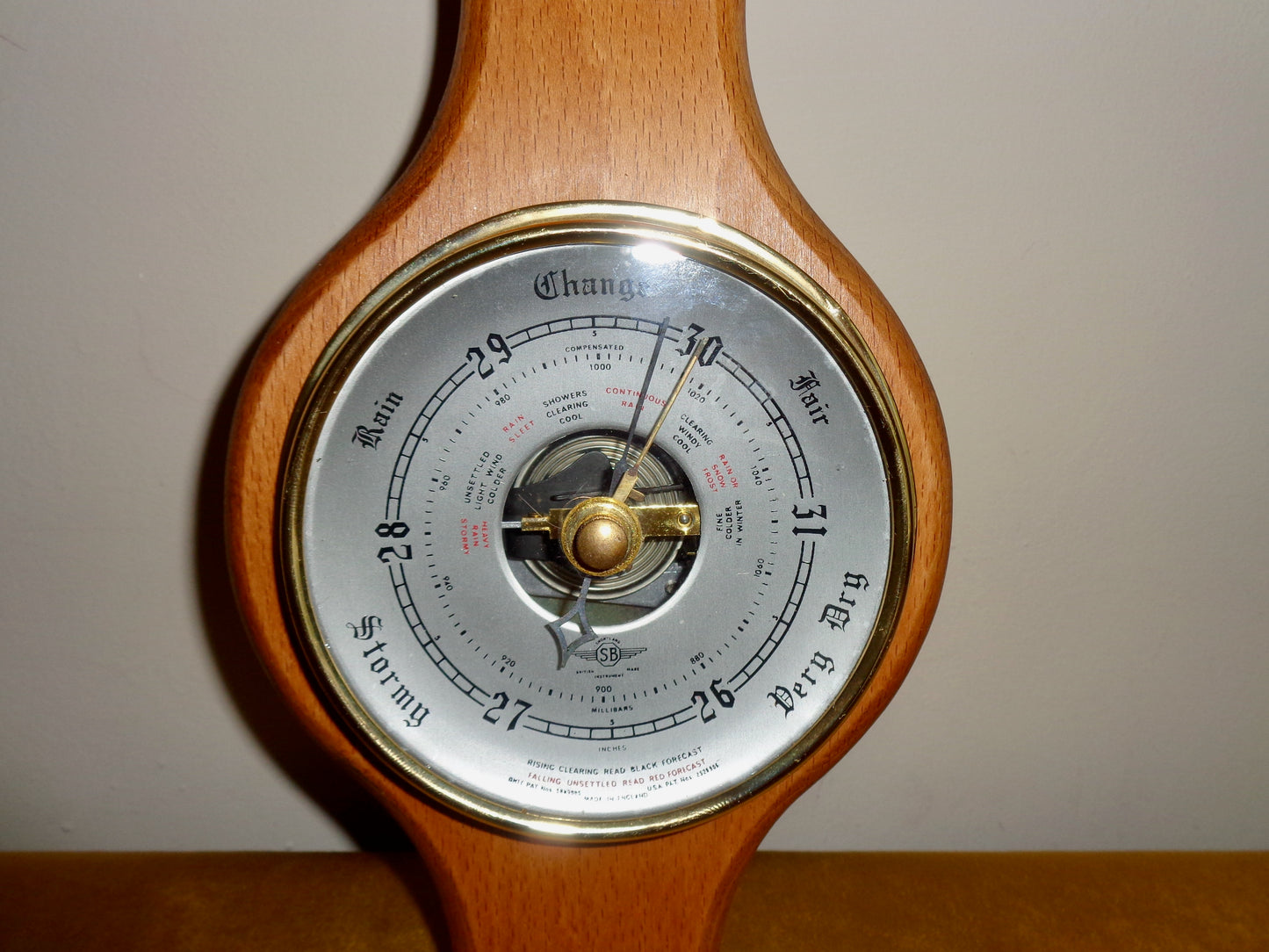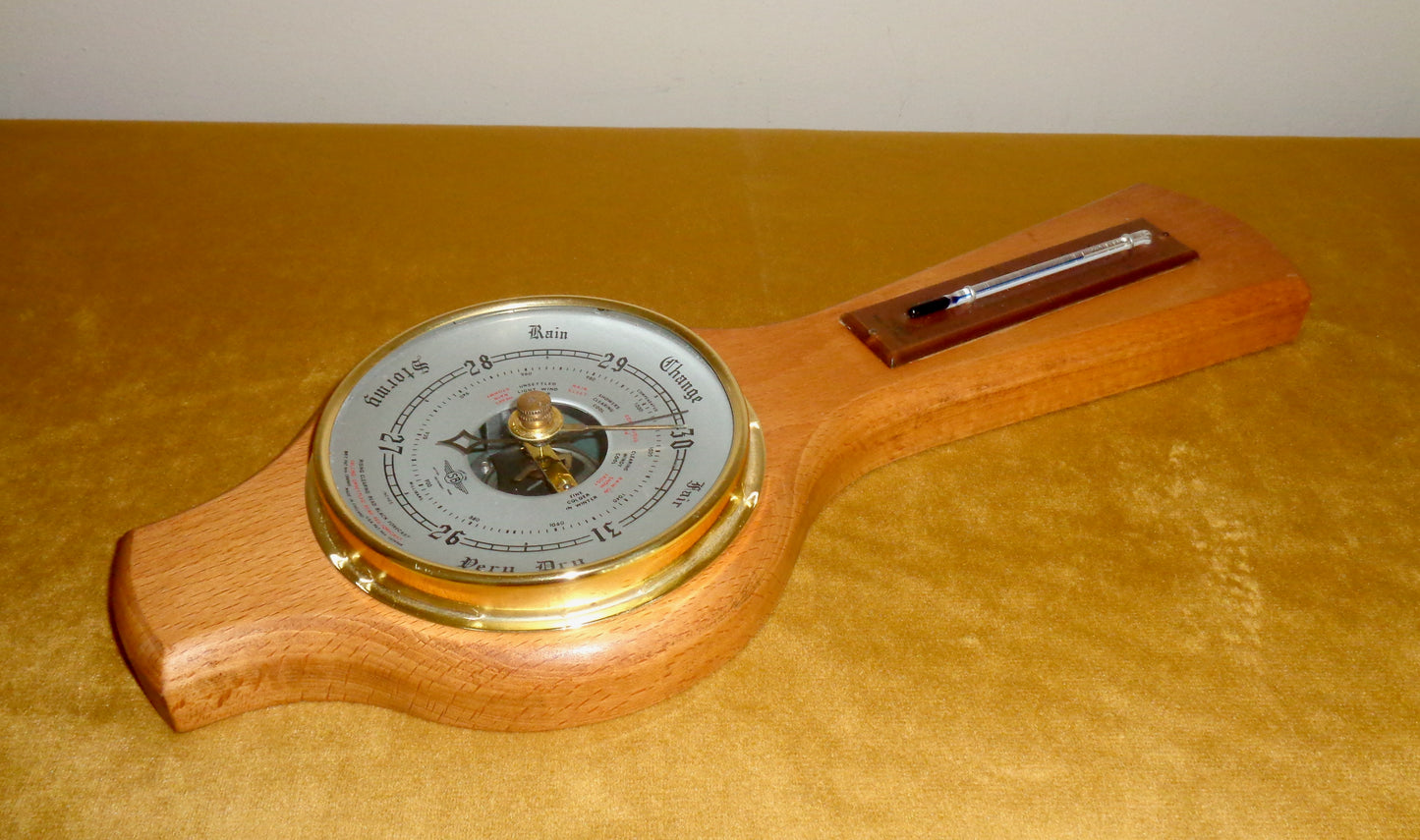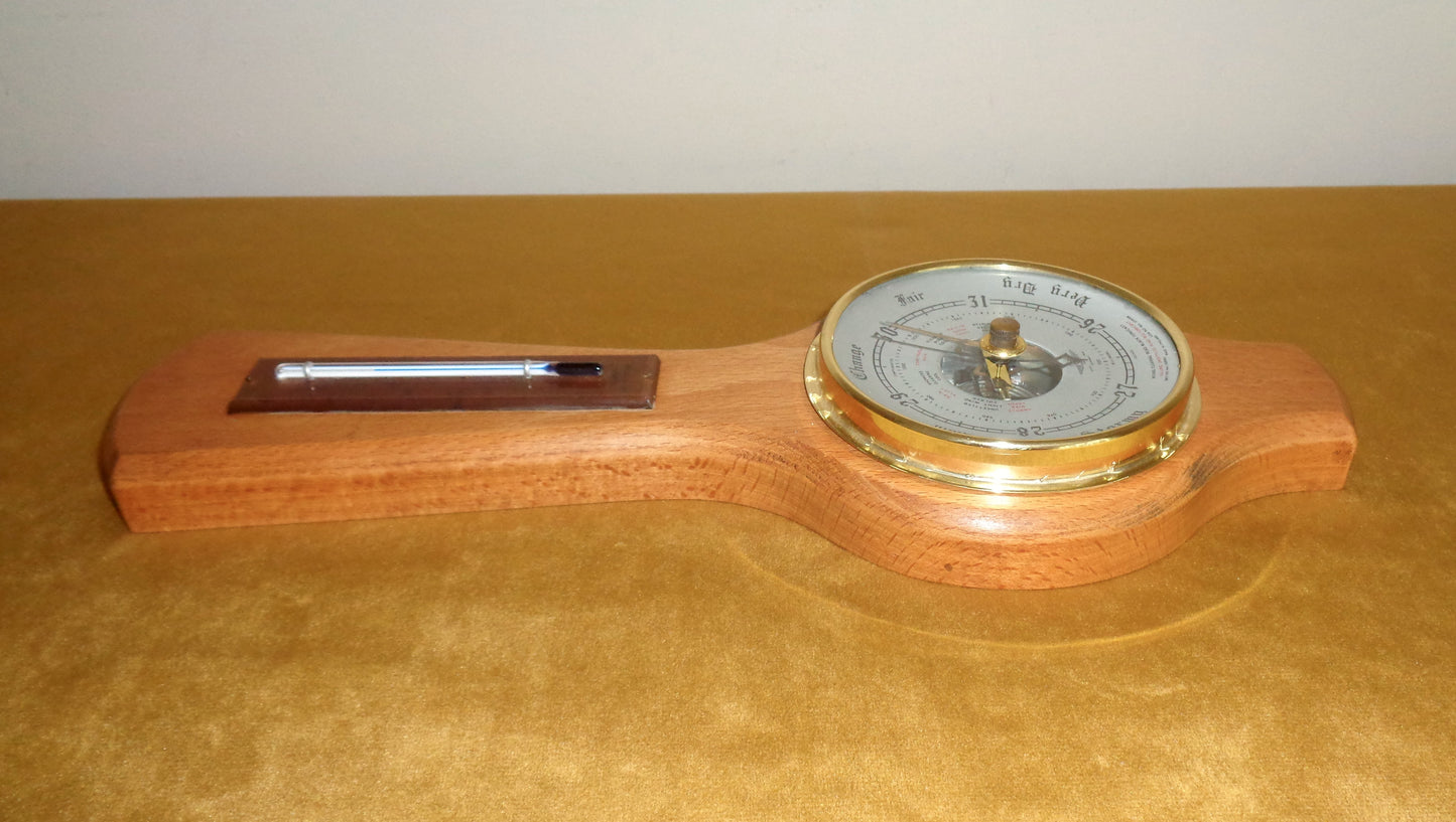 The 4" circular barometer is in good condition, with no chips or cracks. It measures pressure in both inches and millibars: it appears to be working but I’m not sure as to it’s accuracy. The liquid, rectangular, thermometer measures in both centigrade and fahrenheit, and appears to be fairly accurate.