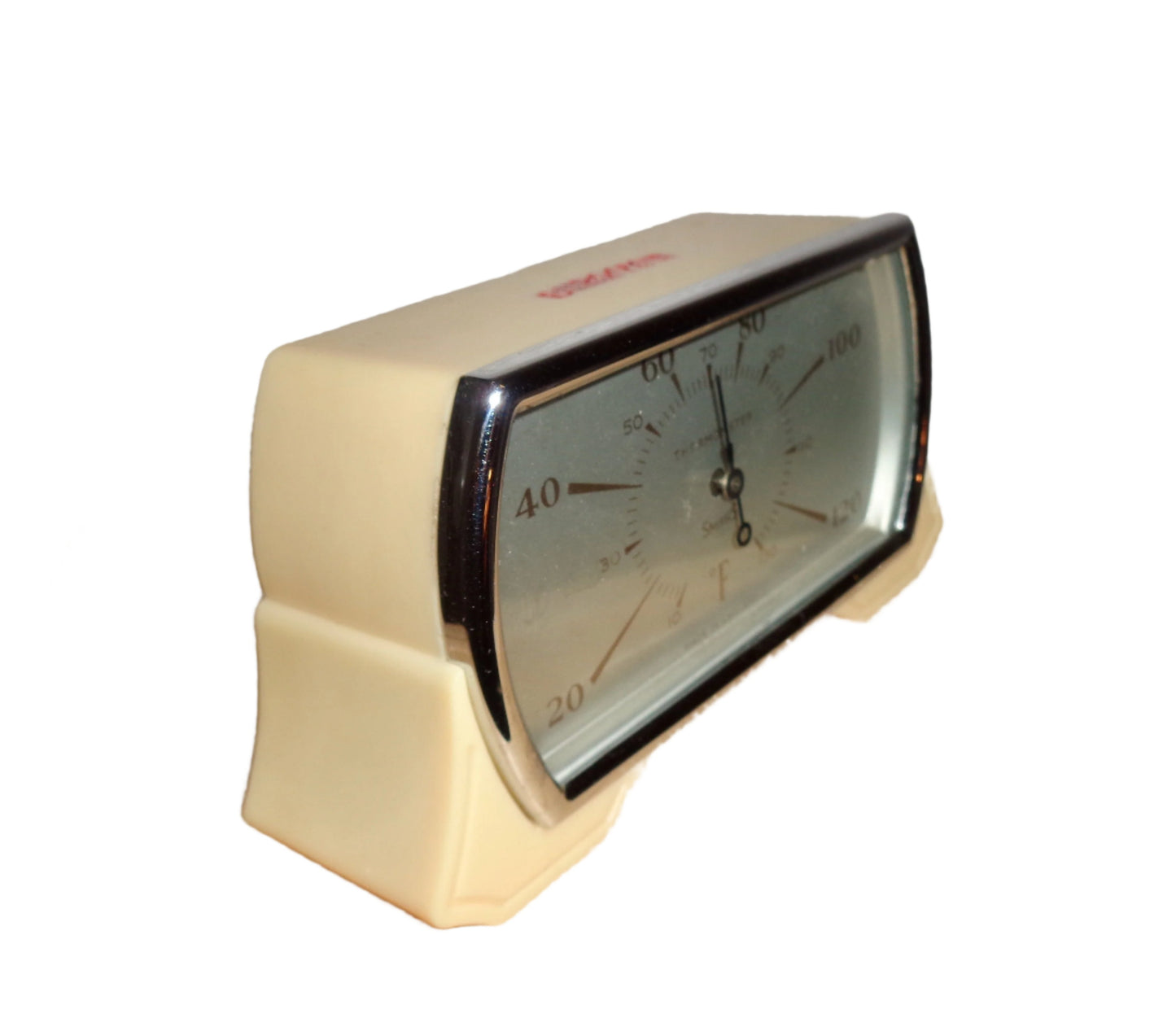 Rectangular in shape, with art deco style feet, it is encased in a cream Bakelite moulding, allowing it to display nicely on an office desk or mantelpiece. This 1940s bimetallic thermometer is in good working order. The white bakelite has no chips, cracks or restoration.