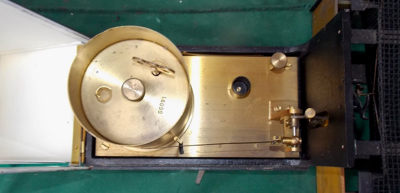 The difference in hair length is only 2.5% between humidities of 0-100%. A hair hygrograph is, therefore, a very sensitive piece of equipment! On this instrument the ‘hair’ is located in the open chimney at the side of the recorder. The contraction and expansion of the hair is conveyed to the recorder arm, which charts the readings over time.