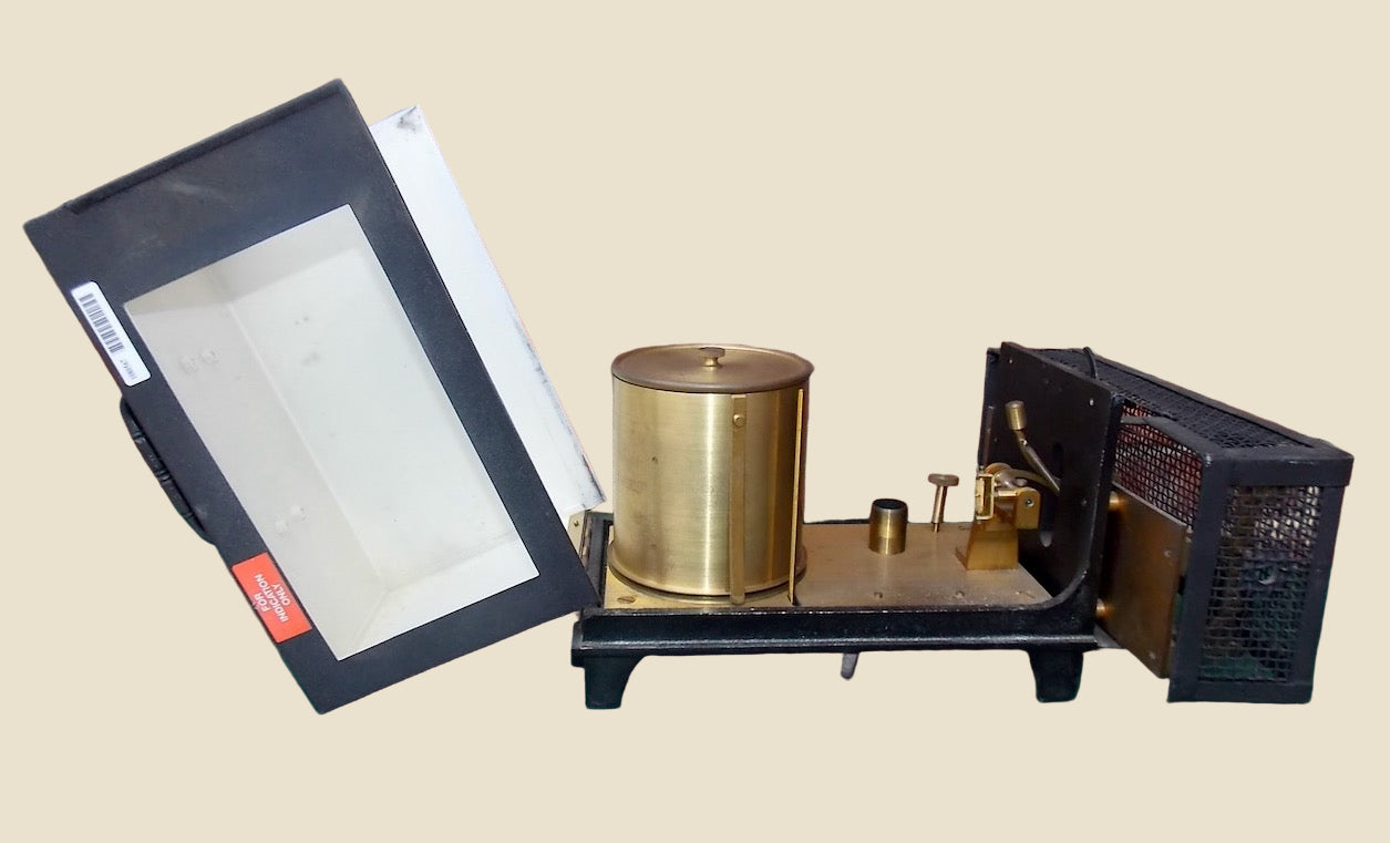 The difference in hair length is only 2.5% between humidities of 0-100%. A hair hygrograph is, therefore, a very sensitive piece of equipment! On this instrument the ‘hair’ is located in the open chimney at the side of the recorder. The contraction and expansion of the hair is conveyed to the recorder arm, which charts the readings over time.