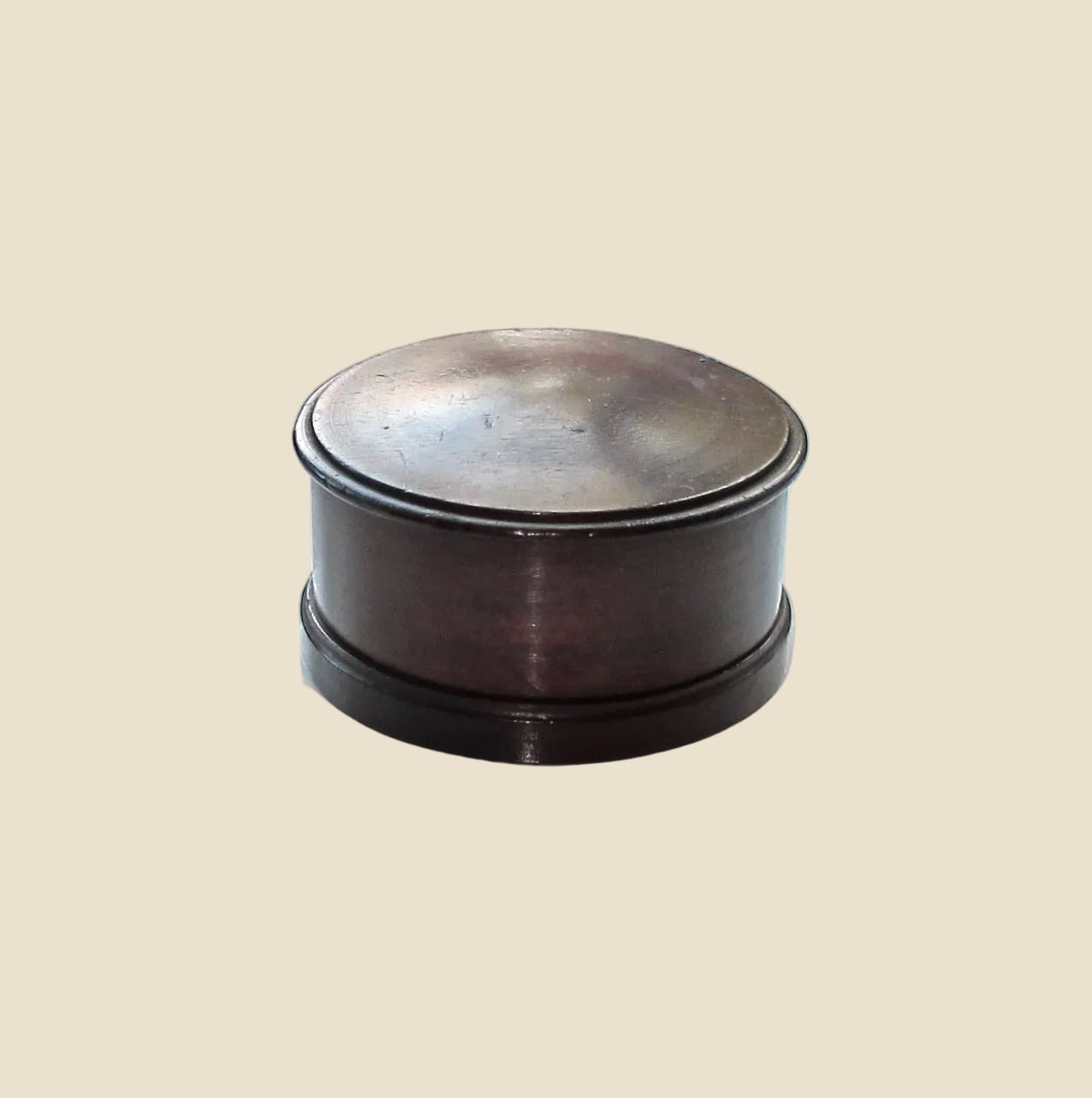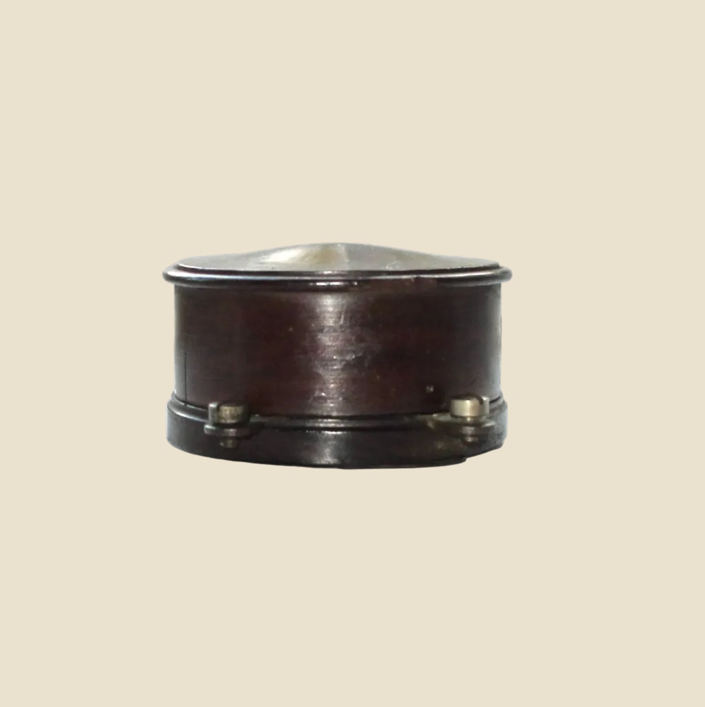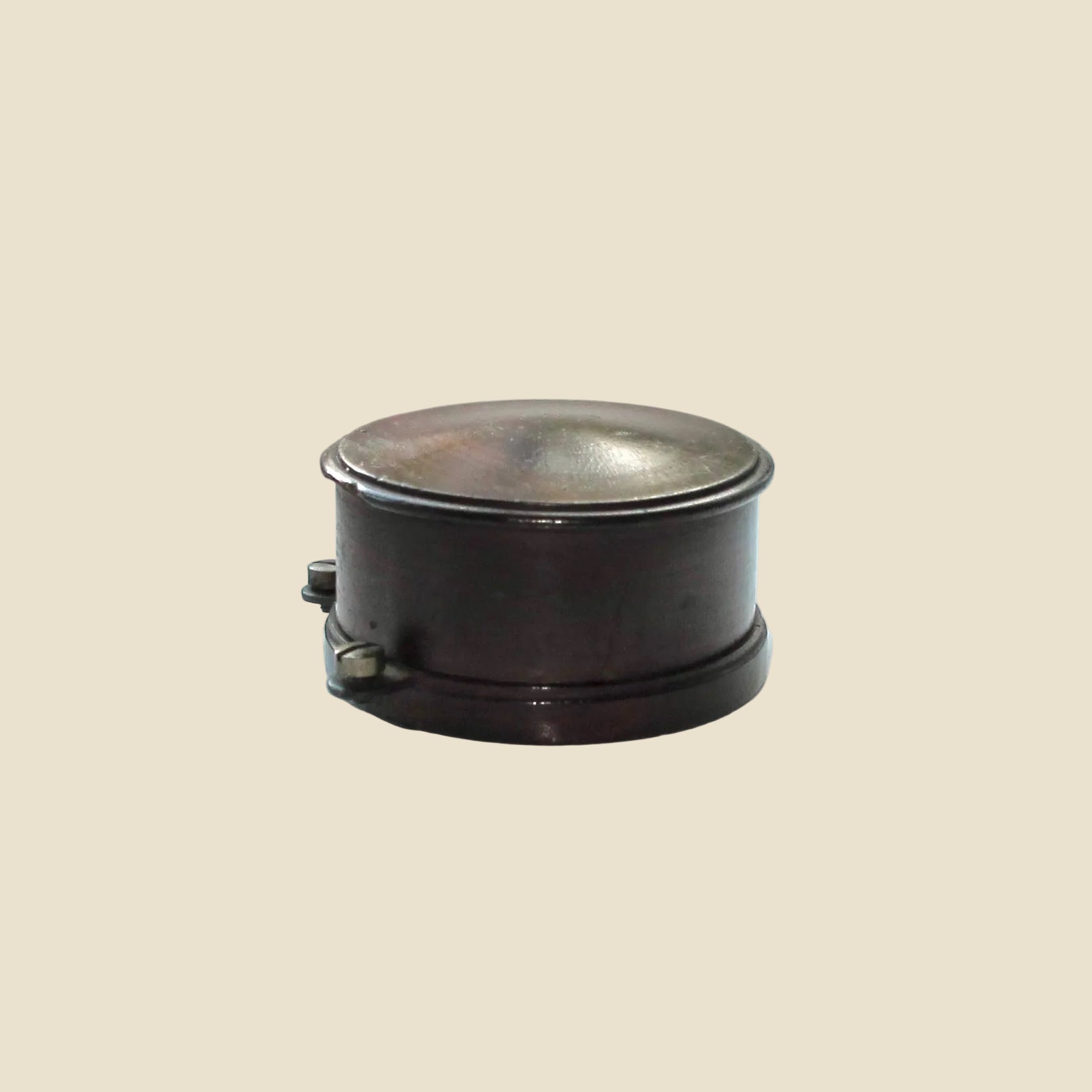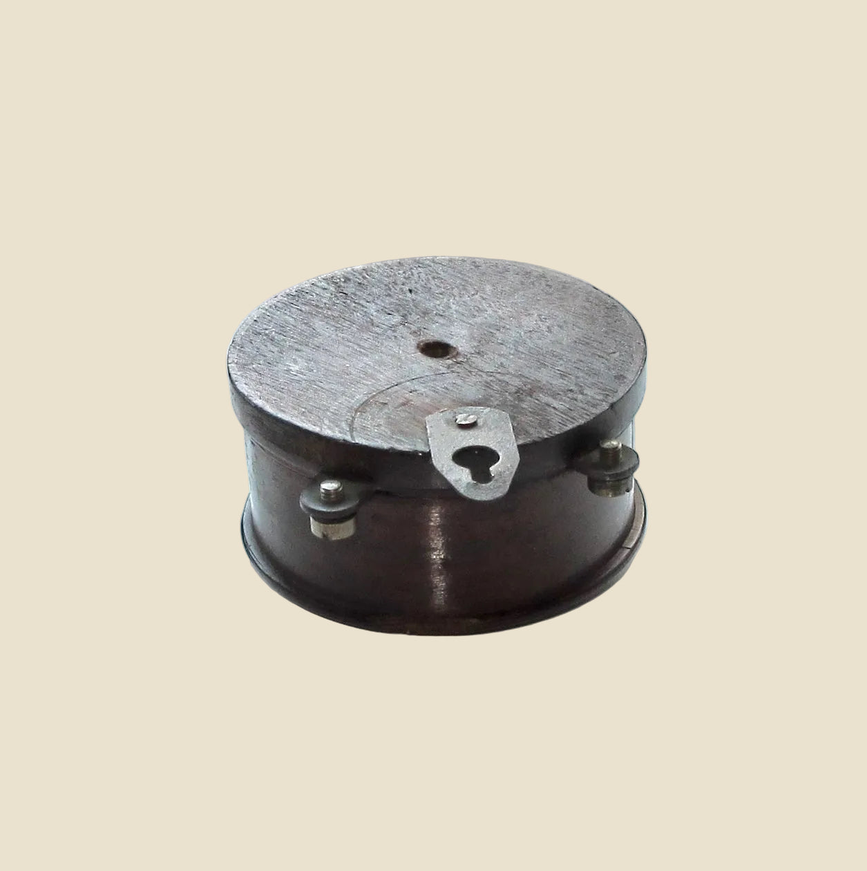 A great piece of vintage social history, in used condition, with scratches and scuffs commensurate with age and use. There are slight cracks in the wood screw-on top but they do not stop it from screwing on the base.