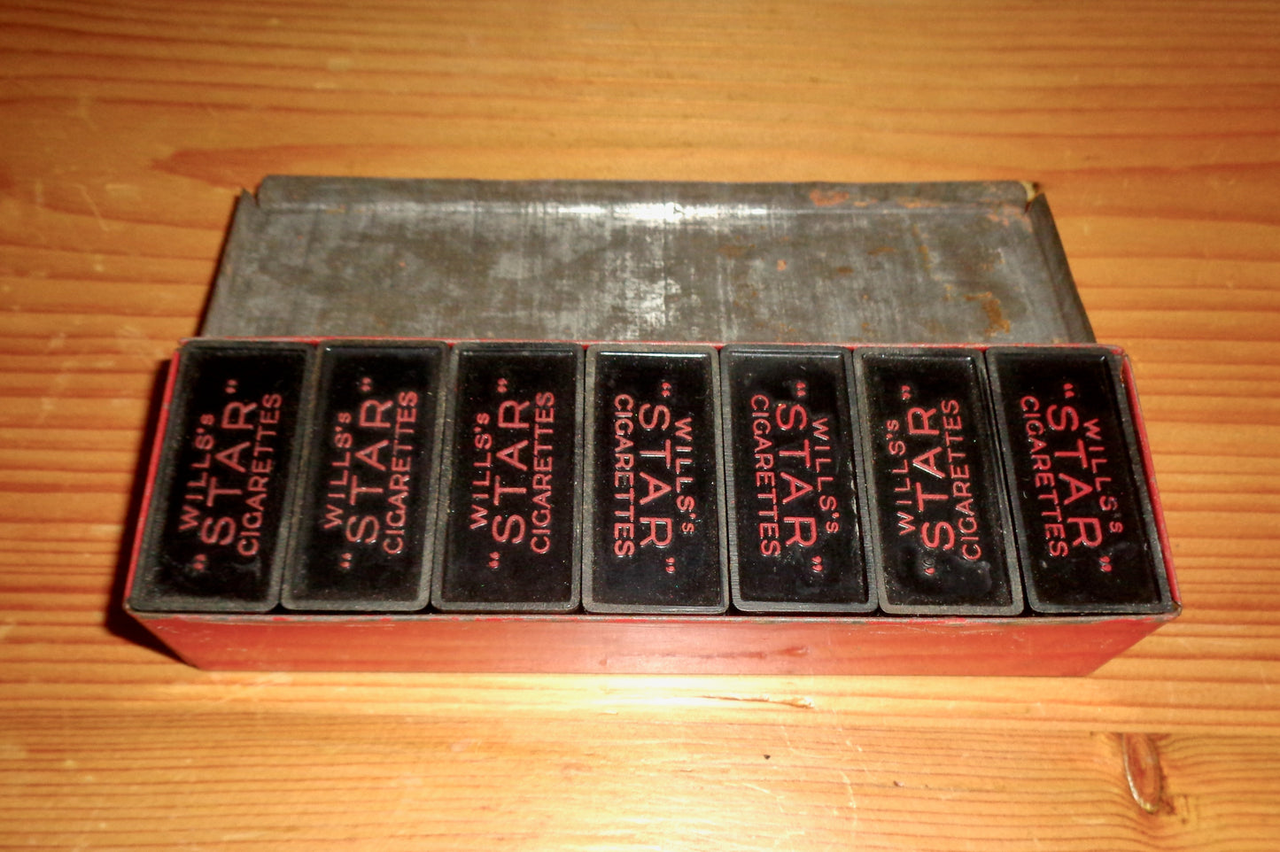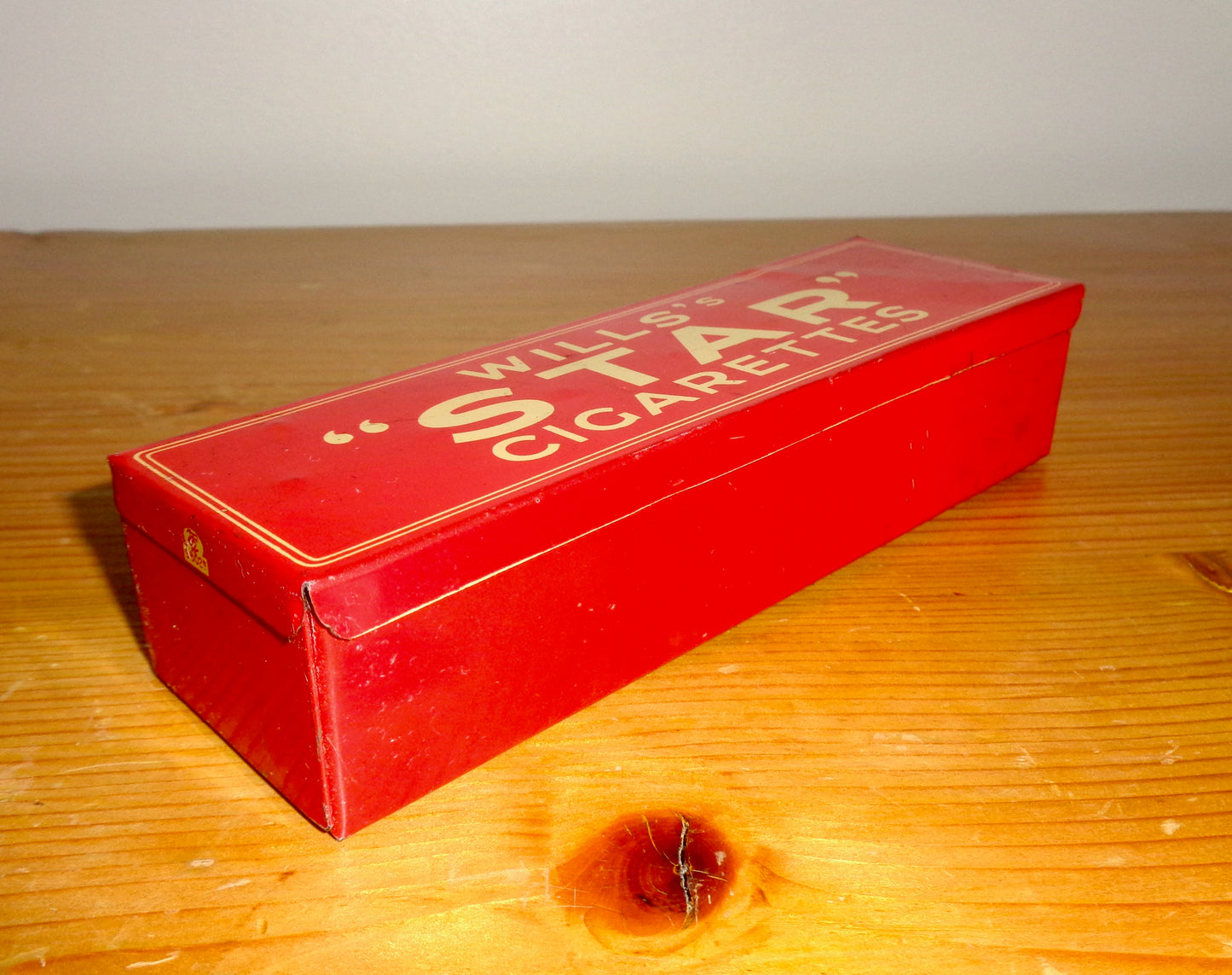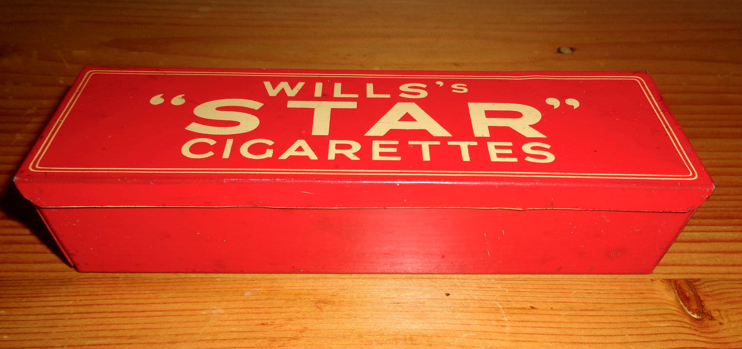 The tin box is slightly scuffed and marked, with some loss of paint. The top of the box bears the logo of Will's 'Star' Cigarettes in cream writing over a red background.