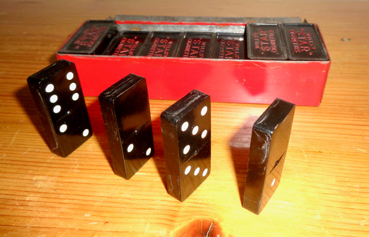 Although the box bears the Wills's Star Cigarettes brand, the dominoes themselves were probably made by Lehman and Co of St George Works, London, UK.