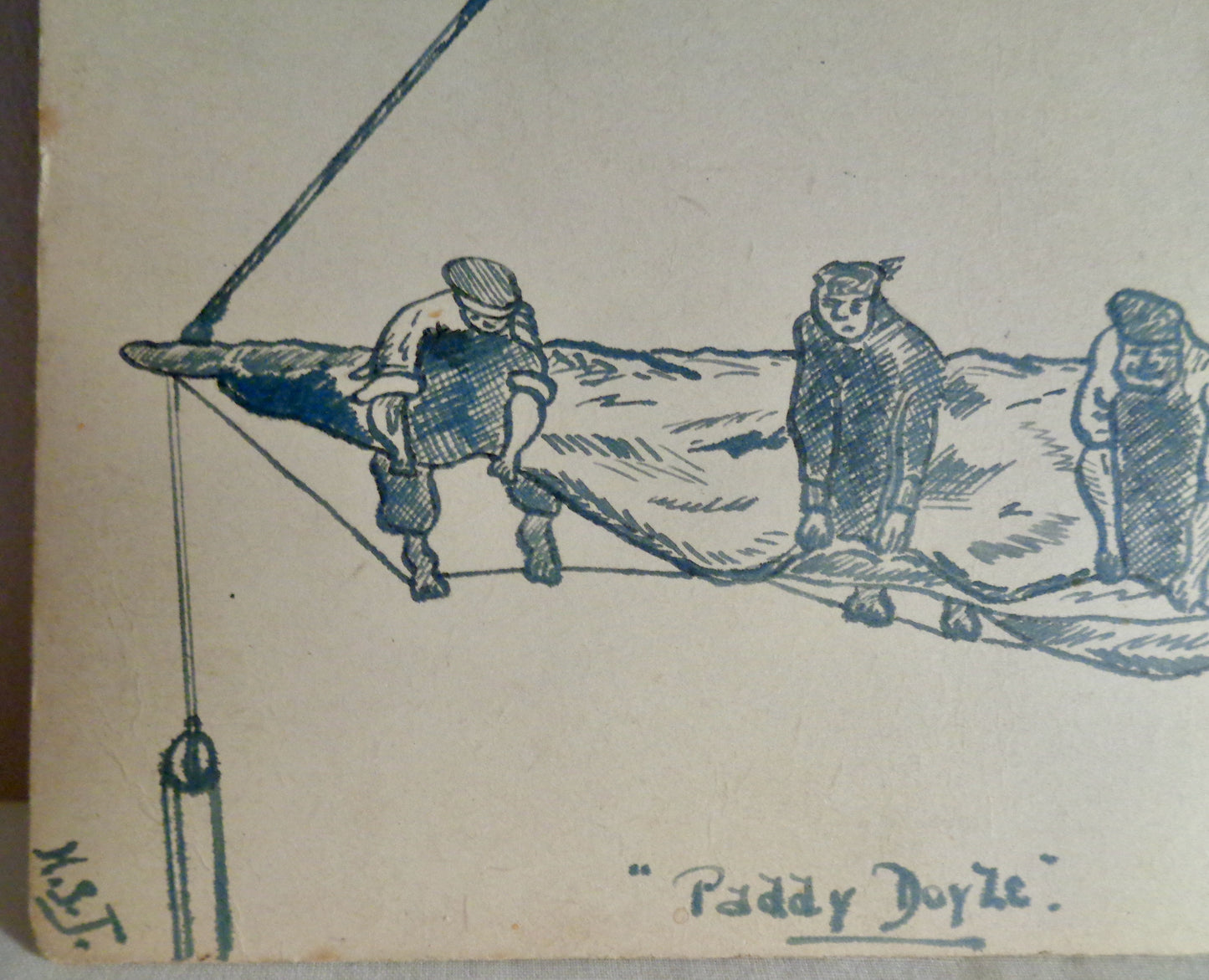 A hand drawn, pen and ink, image adorns the front of the card of sailors furling a sail on a sailing ship, with "Paddy Doyle," written underneath, and signed H.S.J.