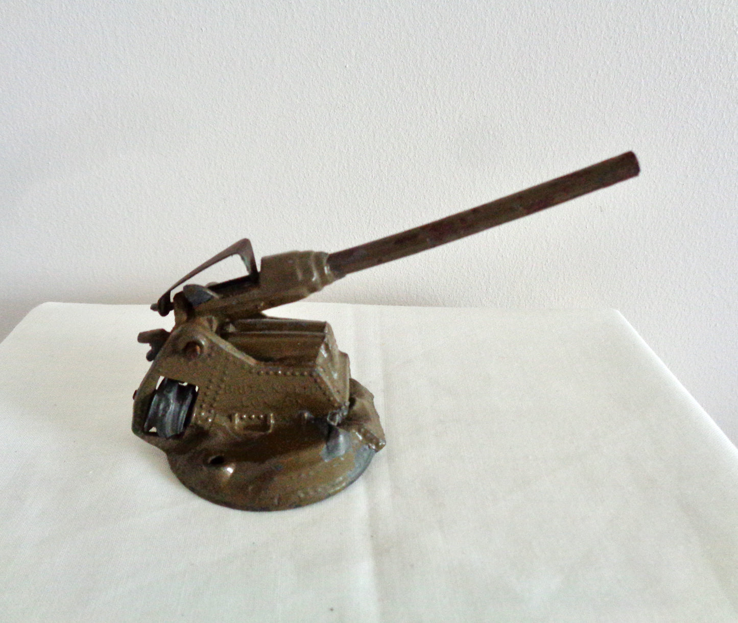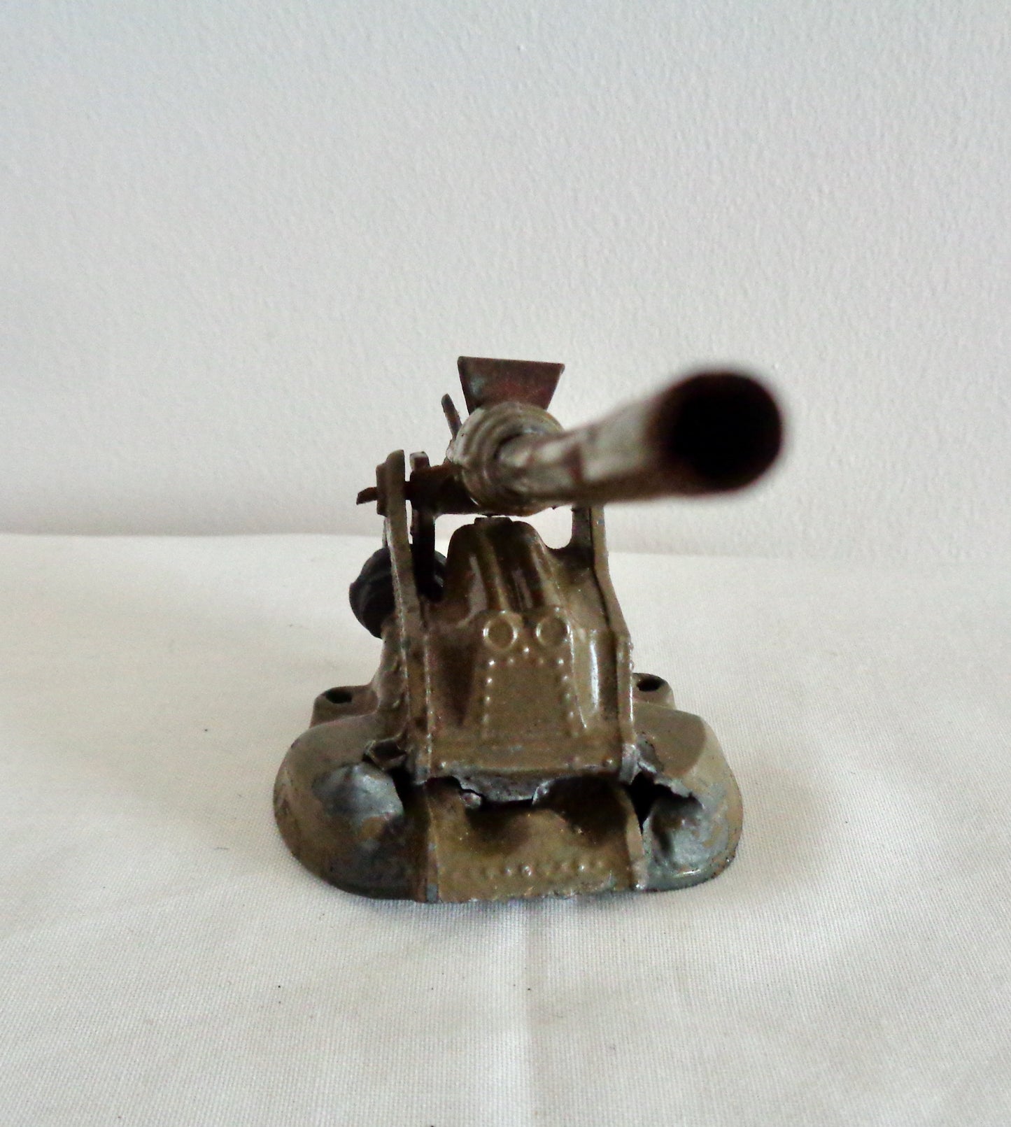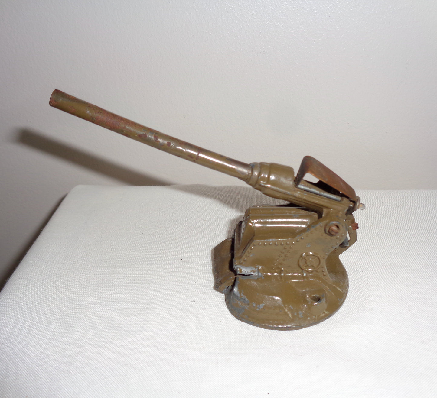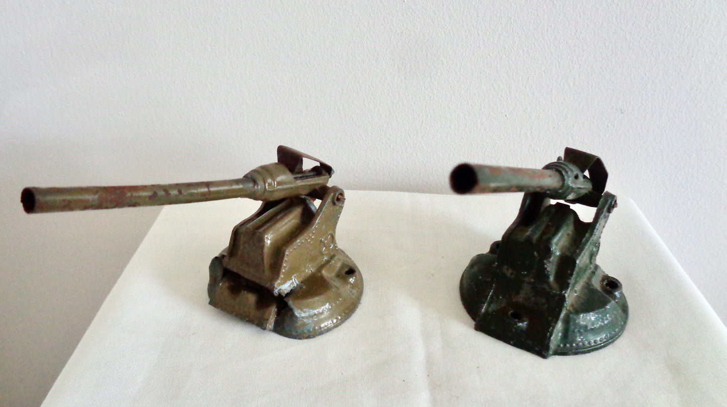 The toys are unboxed and in fair well-used condition. The metal of the lighter coloured gun is crushed at the front. Both guns have their original spring for loading the barrel, and wheel for moving the gun barrel up and down.