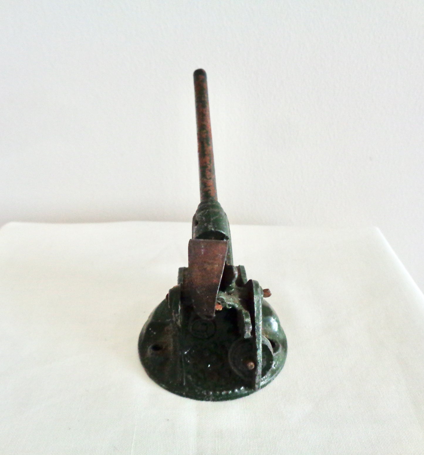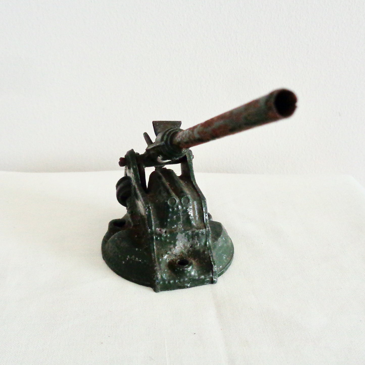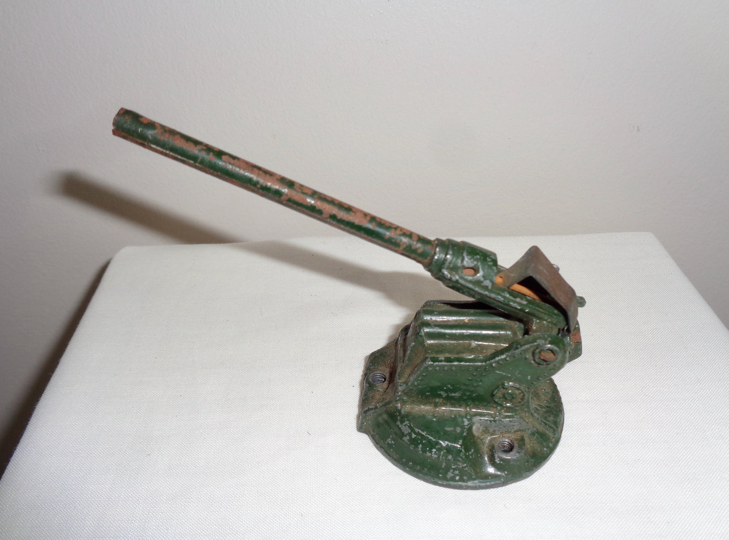 The toys are unboxed and in fair well-used condition. The metal of the lighter coloured gun is crushed at the front. Both guns have their original spring for loading the barrel, and wheel for moving the gun barrel up and down.