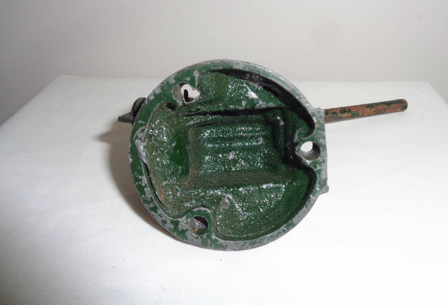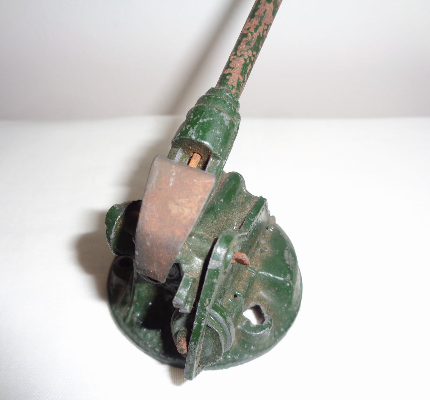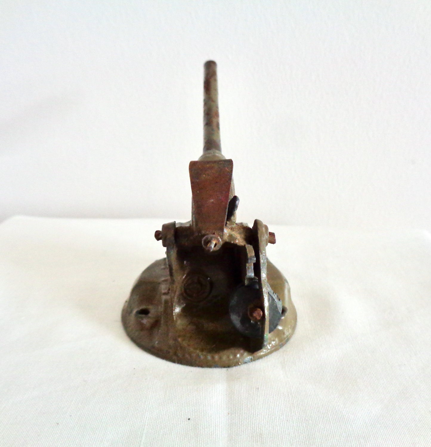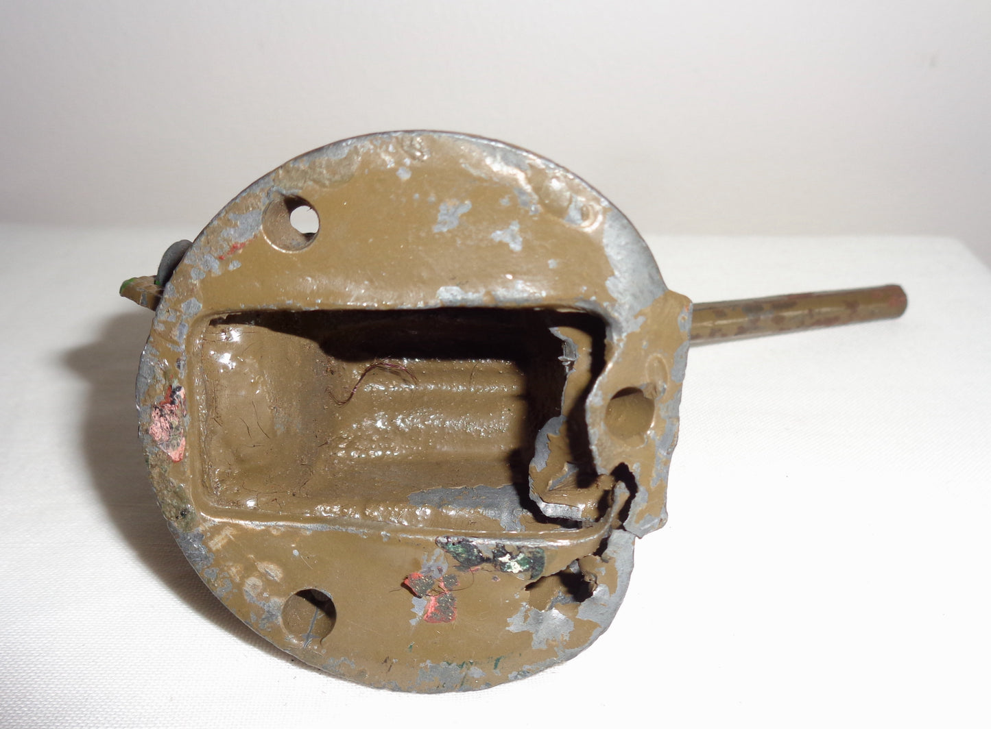 The toys are unboxed and in fair well-used condition. The metal of the lighter coloured gun is crushed at the front. Both guns have their original spring for loading the barrel, and wheel for moving the gun barrel up and down.